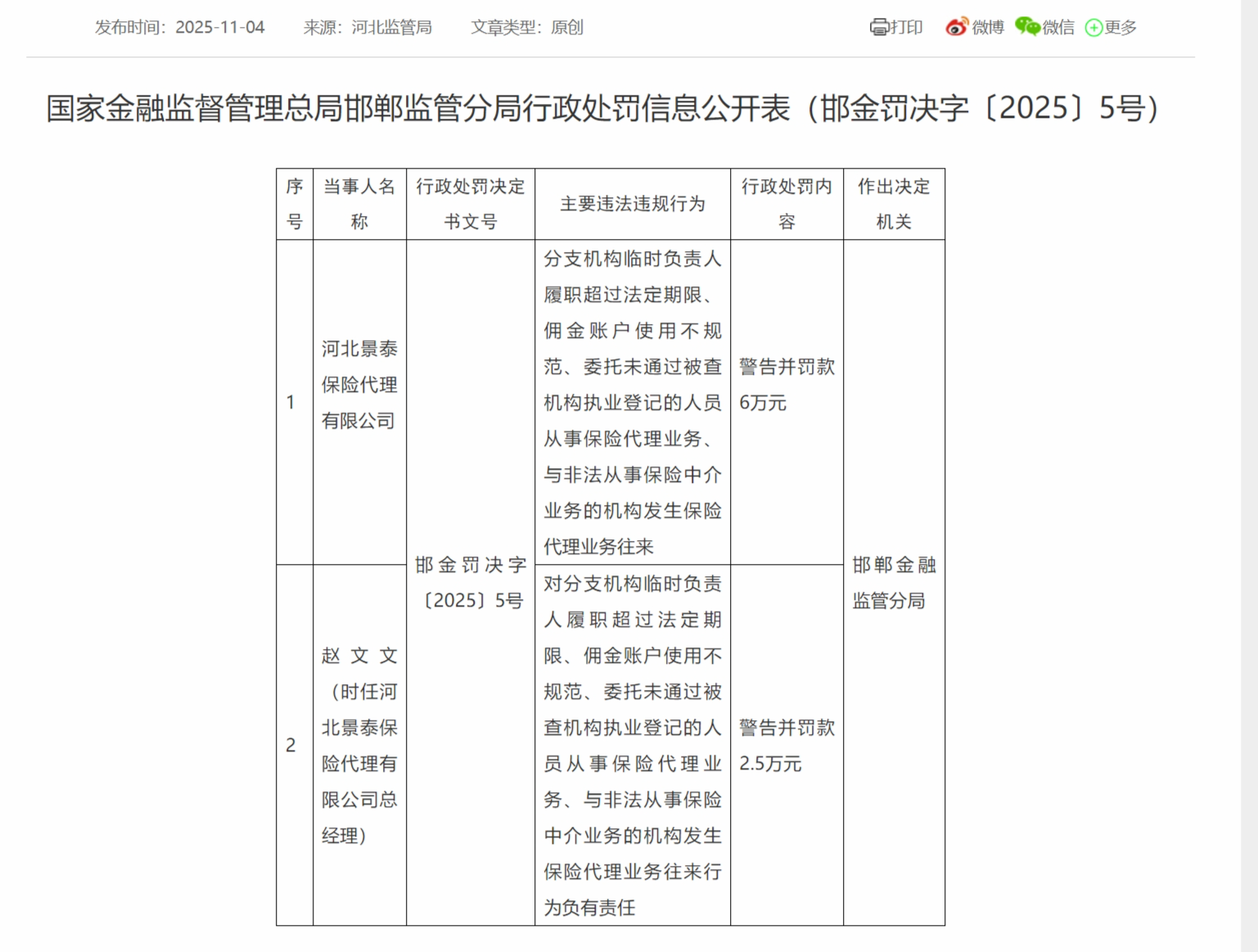 11月4日,国家金融监督管理总局邯郸监管分局行政处罚信息公示表(邯金刑罚[2025]号)从事保险代理业务,非法从事保险中介业务的机构发生保险代理事件,因业务往来受到警告,罚款6万元;赵文文(时任河北景泰保险代理有限公司总经理)从事保险代理业务。